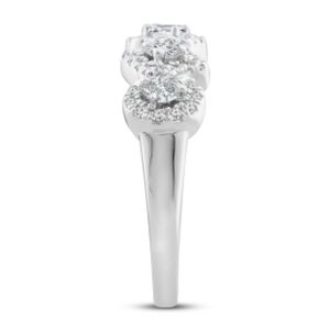 This striking diamond ring collection features five distinctively-shaped diamonds, symbolic of everything she means to you. Each diamond shape has a different meaning, from integrity and wisdom, to confidence, totality, and elegance. This gorgeous 10K white gold ring features a pear-shaped, round-cut, emerald-cut, princess-cut, and oval-cut diamond, each surrounded by a frame of sparkling round-cut diamonds. The ring has a total diamond weight of 1/2 carat.